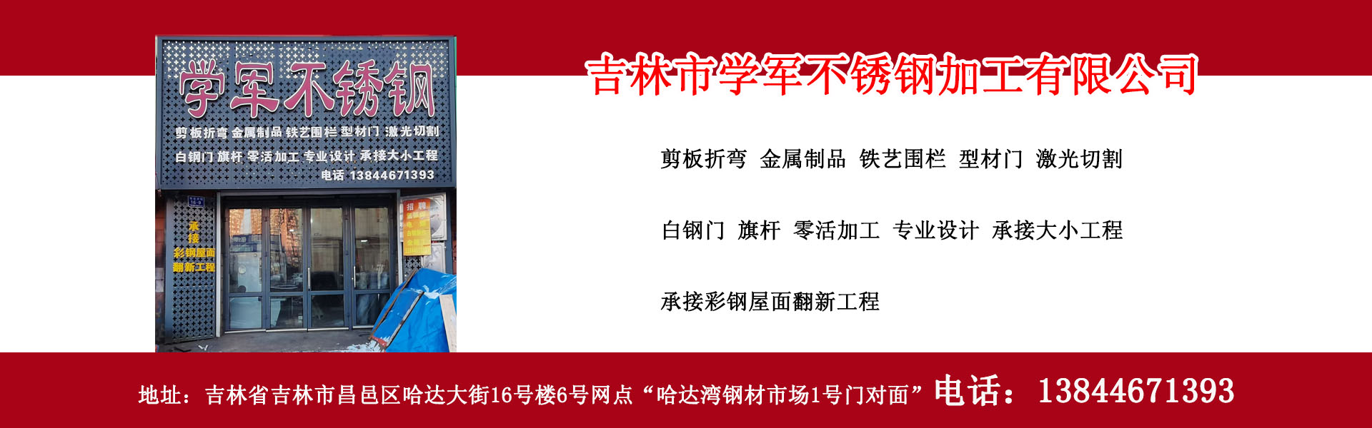 吉林市學軍不銹鋼加工有限公司專業(yè)從事吉林市不銹鋼加工制作、吉林市白鋼門制作、吉林市白鋼隔斷制作、吉林市剪板折彎、激光切割、型材門、電子感應門、旗桿制作、彩鋼屋面翻新、吉林市鐵藝圍欄加工制作等吉林市不銹鋼加工制作、吉林市金屬加工制作服務單位,位于吉林省吉林市。